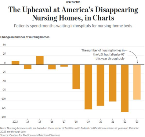 A recent Wall Street Journal article sheds light on the broader implications of this trend, particularly within the realm of nursing homes. While nursing homes represent just a portion of senior living options, they serve as a poignant example of how this shift is reshaping the entire industry. The ripple effect is evident: With fewer seniors opting for nursing home care, these facilities face financial strain and, in some cases, closure. The consequences are profound. Displaced residents must uproot their lives and seek alternative accommodations, placing additional strain on emergency departments and hospitals. This domino effect can lead to delayed medical attention and an overwhelmed healthcare system. Simultaneously, dedicated caregivers who have spent years, if not their entire careers, in these communities are left with the difficult decision of pursuing employment elsewhere or contemplating early retirement.